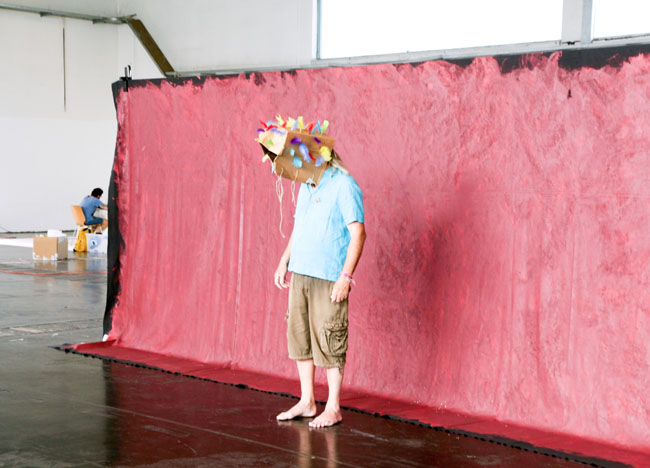 His 12-part series of works “Waiting for Birds“ which he began in 2004, consists of bird nest boxes that are set up in urban areas in various sizes, numbers and arrangements. Josef Bernhard shows an oversized nest box that was built here. So, waiting for birds will be like waiting for Godot if you don‘t actively create awareness and change for the better. The “Transformer“ mask with colorful bird feathers is supposed to reverse everything: to put it in an exaggerated way, a concrete worker becomes a gardener.